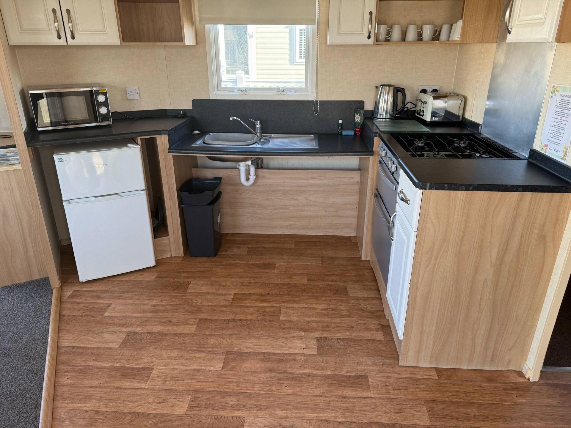 Fully equipped kitchen with fridge/freezer, kettle, toaster, microwave