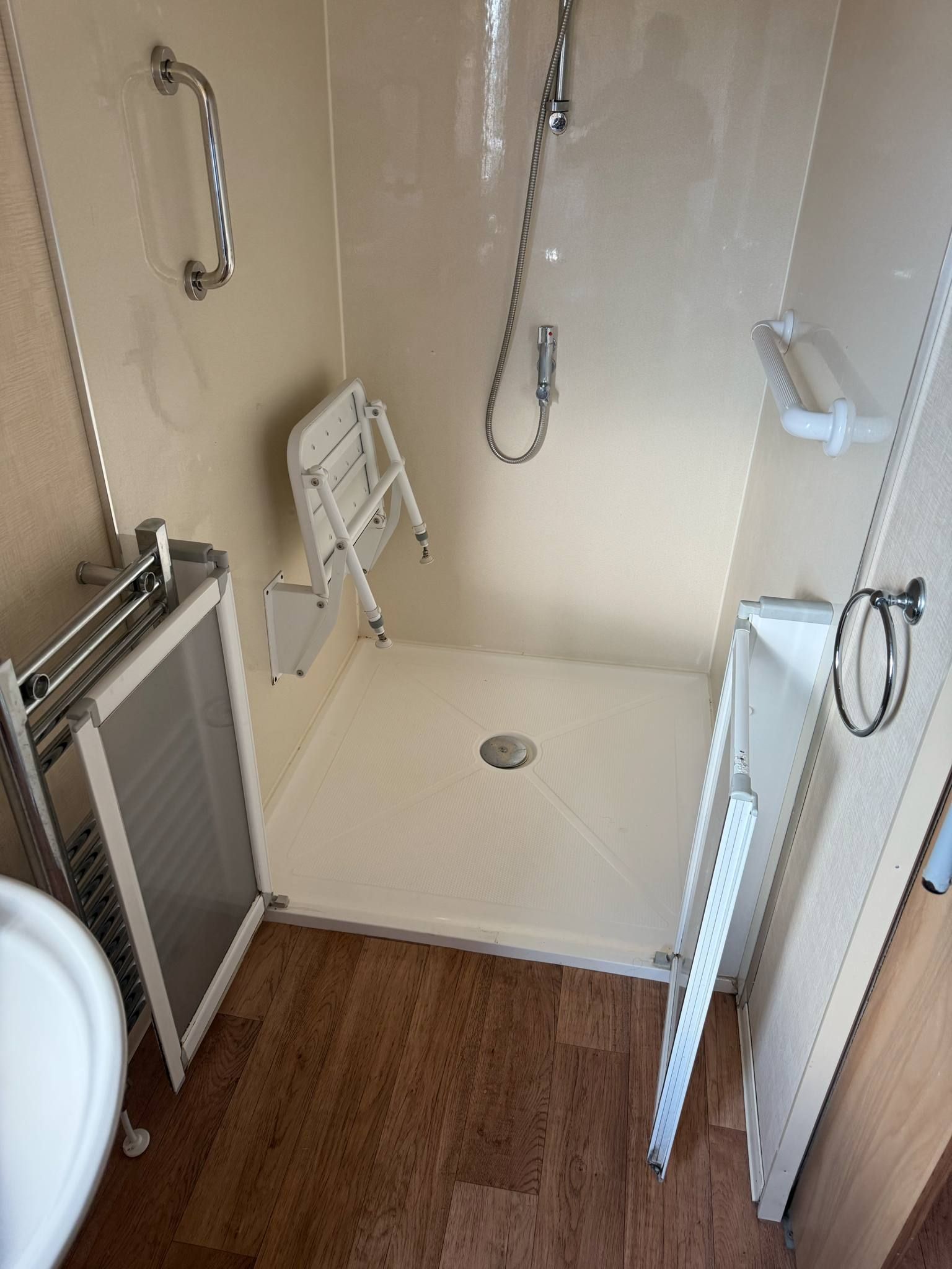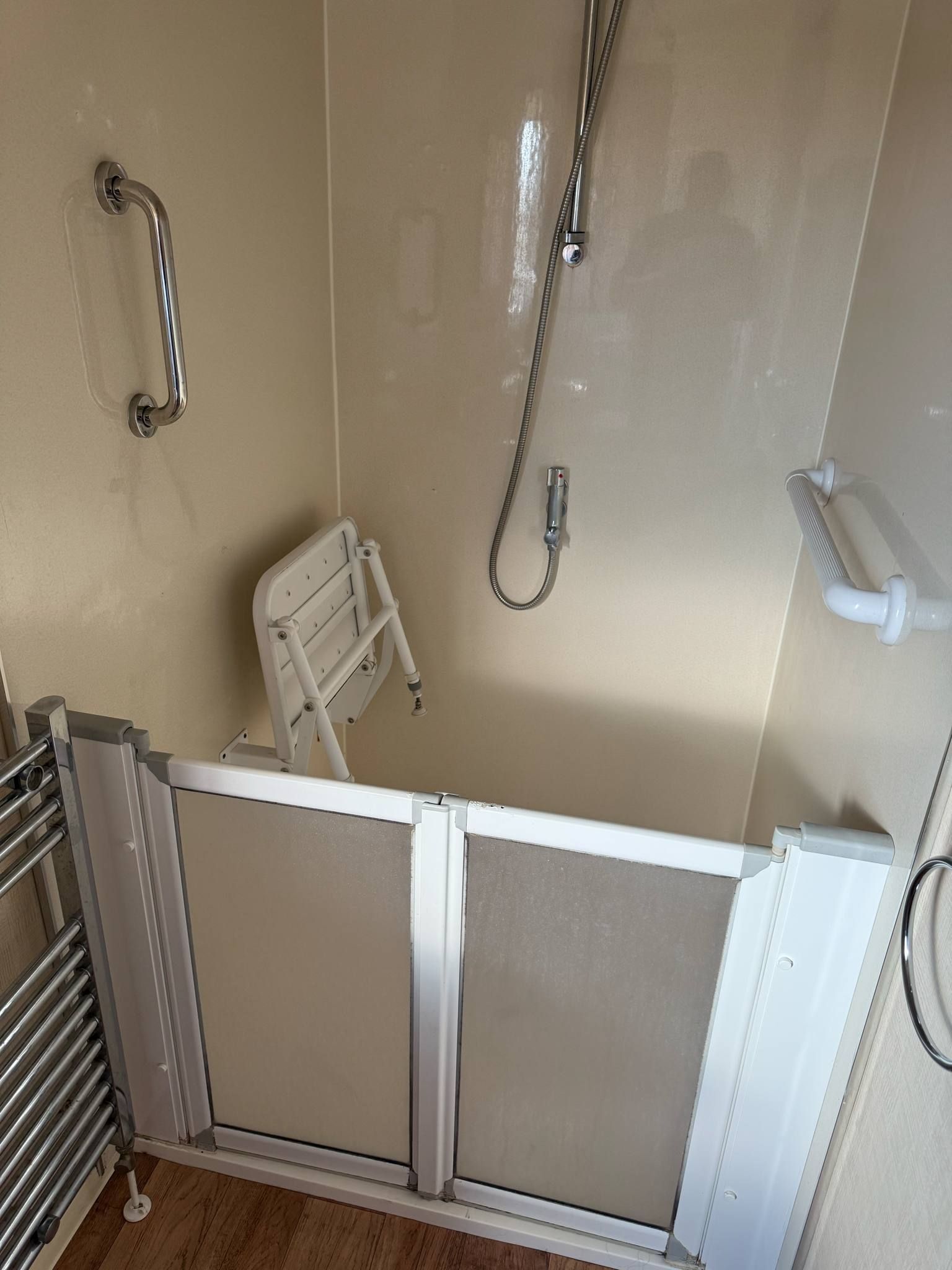 Walk-in shower with drop down seat